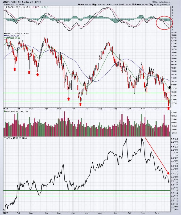 AAPL had established critical price support at 129.50 on June 16. Volume that accompanied this breakdown was heavy, considering that it was the normally light volume period between Christmas and New Year. You can see in the bottom panel that AAPL is completely out of favor and has been underperforming the NASDAQ 100 badly since the beginning of November. If the NASDAQ is to turn higher from here, it’s going to need help from AAPL. We must respect this breakdown until AAPL can clear certain upside hurdles. For me, step #1 is to close back above 129.50. You can see that AAPL has recovered more than 3% today and is currently just above 129.50. But where will it close today? Step #2 will be to clear overhead price resistance at 134.50 and the 20-day exponential moving average (EMA), currently at 136.36 and falling rapidly. Time will tell if there’s enough buying interest at this level to prompt these moves higher. For now, however, we must assume the AAPL breakdown is not a good signal for the health of the overall market.