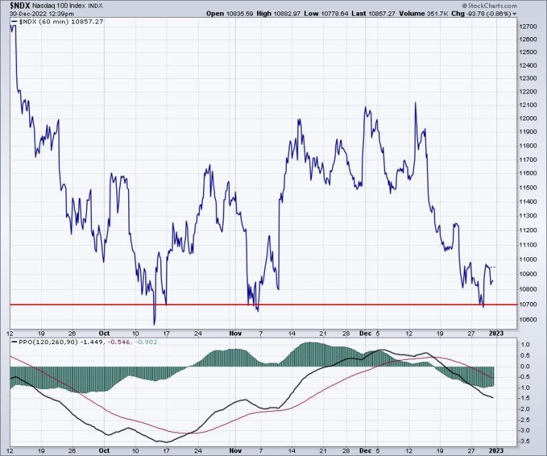 The Nasdaq stock market is hanging by fingernails at the lows from October and November. It is easy to see on a 60-minute line chart.