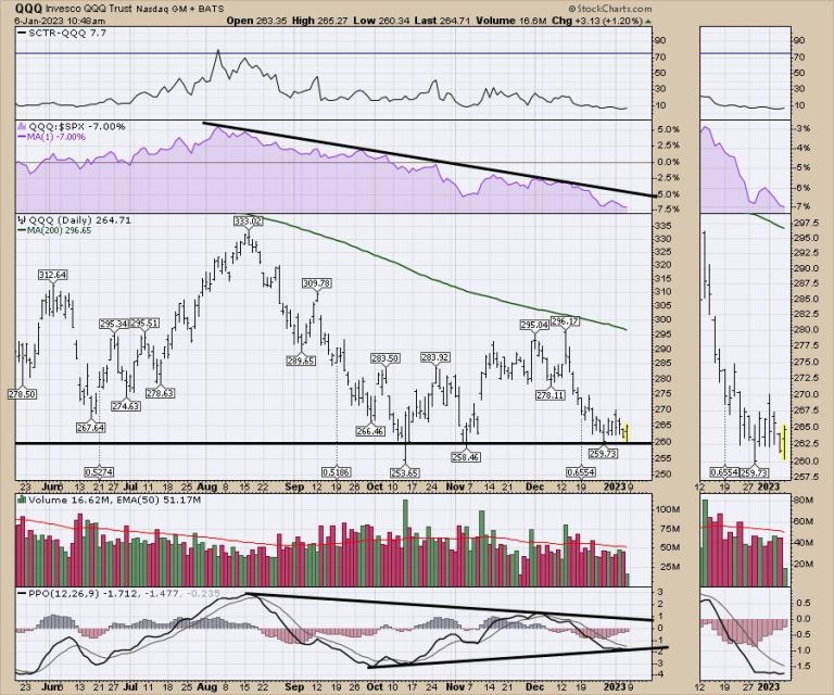 The QQQ chart just keeps drifting. This is the third test of this level. Can we hold?