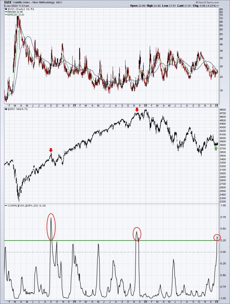 There have only been 3 times in 3 years where the correlation coefficient turned positive by 0.25 or higher. The first signal of that magnitude was received in early-September 2020 and was identified and published right here in my Trading Places blog at that time. You can check out that article HERE. That signal was bearish, because the VIX and S&P 500 were moving higher together. I interpret that to mean that, as the S&P 500 kept advancing, fear was growing. All it took was a stumble and the bears quickly gained control. The second signal occurred in November 2021, just as money began rotating more defensively. That signal proved quite useful as well. Now we have the opposite. The S&P 500 finished December and began January on a sour note. But the VIX is declining, suggesting that fear is dissipating. In this case, any bullish news could quickly put the bulls in charge. It may be temporary, however, so stay tuned.