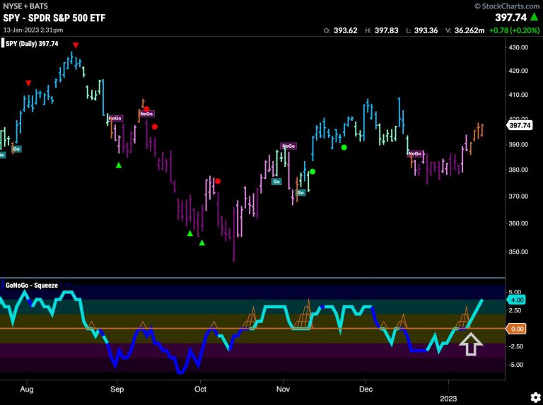 The chart below shows the $SPY with daily prices and the full suite of single security GoNoGo Indicators applied. As we can see, price has rallied this week and caused GoNoGo Trend to paint a string of amber “Go Fish” bars. In the lower panel, we see that GoNoGo Oscillator broke above the zero line, signaling that momentum had shifted away from the NoGo, and that led to the color change in price. We will look to see if GoNoGo Trend can move into “Go” bars if price goes higher.