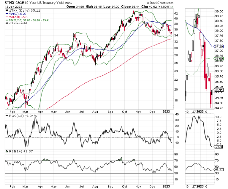The U.S. Ten Year Note yield (TNX) broke below the crucial 3.5% support level, temporarily, and the S&P 500 (SPX) and the New York Stock Exchange Advance Decline line (NYAD) both moved above their respective 200-day moving averages. Get more details on both below.