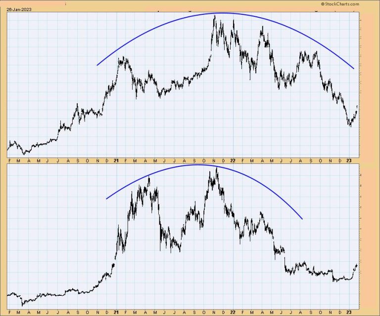 Last month in our DecisionPoint Trading Room I gave our viewers a pop quiz. I presented two similar charts without names or price scales, and challenged them to identify them by the shape of the price indexes alone. The point I was trying to make was that, while they were different, they were driven by similar waves of psychology. They began at a 2020 low, moved to a 2021 high, formed great rounded tops, then crashed in 2022.