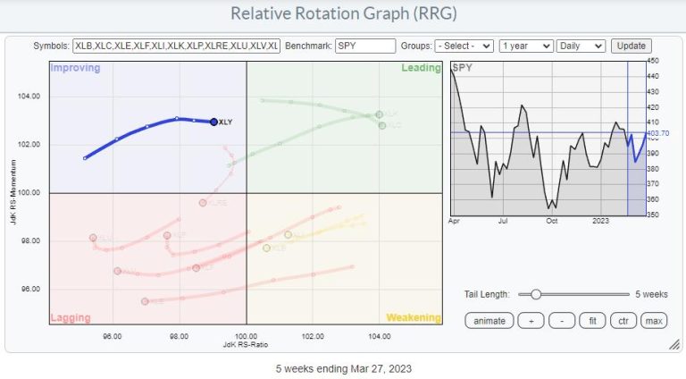 On the weekly RRG, the tail for XLY, Consumer Discretionary, is inside the improving quadrant and heading at an RRG-Heading of roughly 90 degrees. Not ideal; Somewhere between 0-90 is stronger as it indicates that the trend is still picking up speed, but not wrong either.