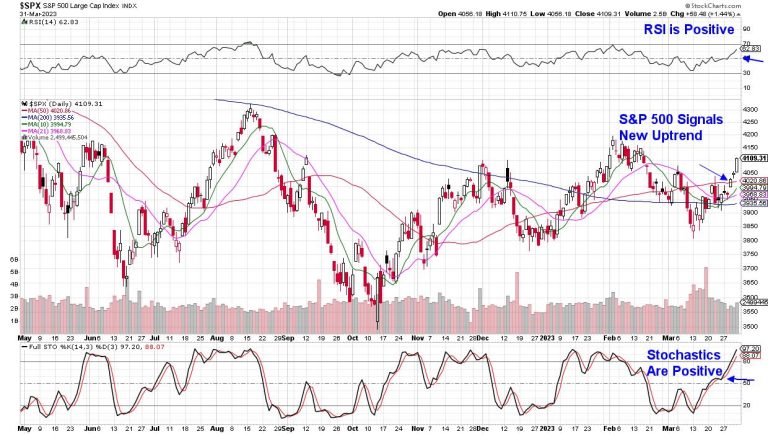 While the markets have entered a new uptrend, roadblocks remain, as inflation levels remain elevated despite hints of a slowdown that were reported last week. In other words, continue to keep your stops tight until further evidence that the Federal Reserve has slowed their rate hike campaign. The next FOMC meeting will take place in early May.