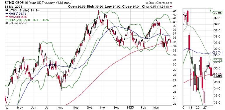 Yet the U.S. Ten Year Note yield (TNX) is still hovering near 3.5%. This suggests that bond traders are not fully convinced that inflation is dead, while still waiting for the recession to be fully apparent. Unfortunately, this plus-minus data means that the Fed may still raise rates another quarter point at its next meeting, which is scheduled for May 2-3.
