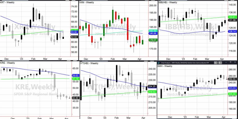 S&P 500 (SPY): Tight range to watch this week — 412-415.Russell 2000 (IWM): 170 support, 180 resistance. Dow (DIA): Peeking over the 23-month MA, 336 — impressive if holds.Nasdaq (QQQ): 312 support, over 320 better.Regional Banks (KRE): 41.28 March 24 low held; now has to clear 44.Semiconductors (SMH): 258 resistance with support at 250.Transportation (IYT): 219-228 the wider range to watch.Biotechnology (IBB): 130 major pivotal area, 135 resistance.Retail (XRT): 58-64 trading range to break one way or another.
