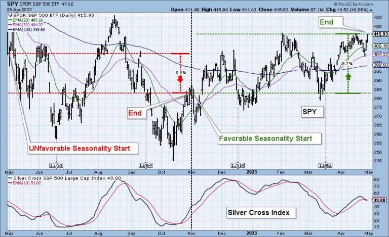 Conclusion: Having studied this Seasonality Timing System over the years, I have concluded that it is better to throw in a little brain power, rather than making decisions on a strictly by the mechanical basis suggested by the model. With the beginning of the unfavorable period, I will keep in mind that negative seasonality is one thing that will be working against long positions for the next six months, but I will rely primarily on our indicators for our analysis and decision making.