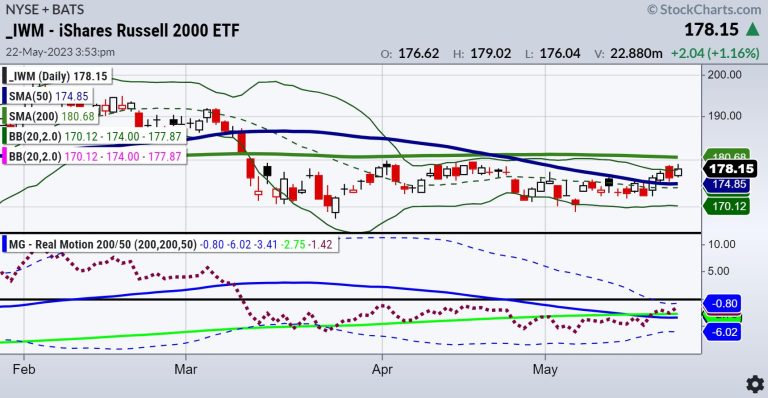 Real Motion-our proprietary indicator that lets you see hidden strength or weakness during market trends-right now is as interesting as the diversion in price between Gramps and Granny. IWM’s momentum indicator cleared the 50 and 200-DMAs changing phase to accumulation. That is a bullish diversion for IWM, as the price is still under the 200-DMA.