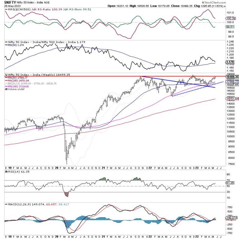 After taking a brief breather last week, the Indian equities extended their up move this time. After trading buoyant and with limited downsides all through the last five sessions, the headline index ended on a decently positive note. The Nifty oscillated in a 329.70 points range and while it ended towards its high point, the volatility gauge INDIAVIX once again declined towards its lower levels seen in the recent past. The uncertainty around the US Debt Ceiling remained as the US markets awaited some deal but stayed largely buoyant. Amid strong setup, the benchmark index closed near its crucial levels while posting a decent weekly gain of 295.95 points (+1.63%).