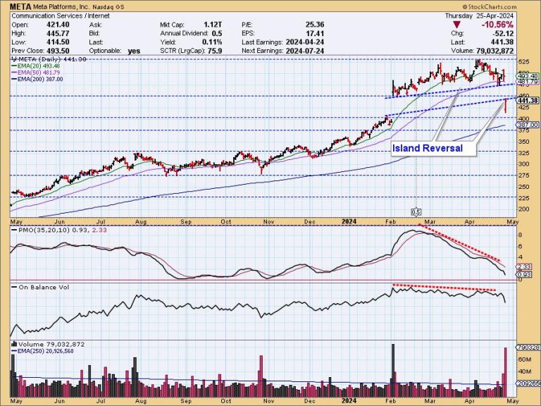 Whenever we see price gapping up or down, as happened with META in February, we prepare for the possibility of an island reversal. After the gap up, price forms a cluster, the island, and we ponder the possibility of a gap down to complete the reversal. During the formation of META’s island news coverage was very positive, but yesterday’s earnings report made investors unhappy, and META really took a dive, jumping down across the gap.