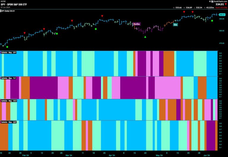 Good morning and welcome to this week’s Flight Path. Equities rebounded this week as we saw a string of strong blue “Go” bars and price hit a new higher high. Treasury bond prices returned to a “Go” trend with their own week of strong blue bars. Commodities struggled again as GoNoGo Trend was unable to maintain “Go” colors. The dollar shows uncertainty at the end of the week with an amber “Go Fish” bar.