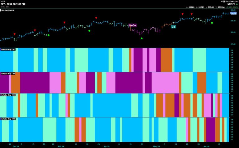 The weekly chart shows a return to strength this week. GoNoGo Trend painted a strong blue “Go” bar as price challenges prior highs. GoNoGo Oscillator bounced off the zero line last week giving us signs of Go Trend Continuation (green circle). Now, momentum is positive and moving higher at a value of 3.