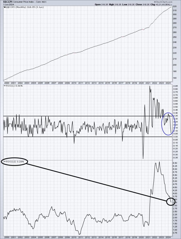The one-month rate of change (ROC) of Core CPI has been trending lower since peaking in early 2021. That’s three years of a sustainable decline. I’m really not sure how much longer the Fed needs to see it drop unless they’re literally waiting for it to hit 2%. Furthermore, the last reading in June showed the lowest reading yet—just 0.006%, less than one-tenth of one percent. The last two months’ Core CPI readings, annualized, is just 1.32%. Again, what do we need to see?