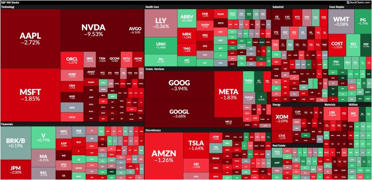 The StockCharts MarketCarpet was a sea of red, with technology stocks leading down. Some pockets of strength can be seen in Consumer Staples, Real Estate, and Utilities, the leading sectors in Tuesday’s trading.