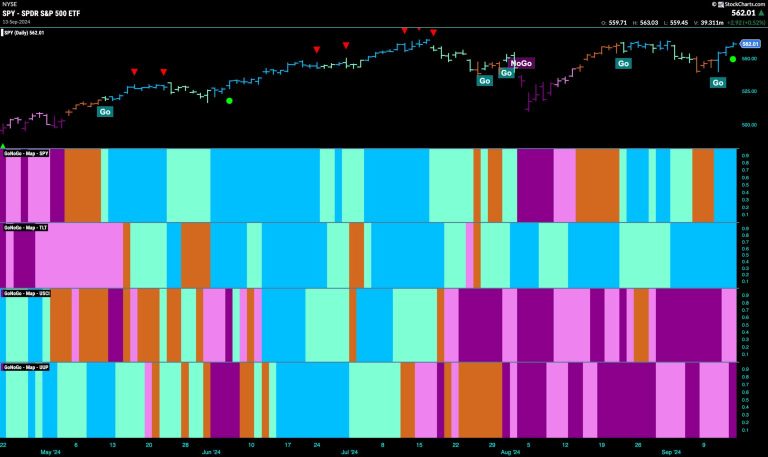 The GoNoGo chart below shows that after several amber “Go Fish” bars representing uncertainty the “Go” trend found its feet again this past week. Strong blue “Go” bars returned on Wednesday and we saw prices climb close to prior highs once again. If we turn our attention to the oscillator panel we can see that the oscillator broke through the zero line into positive territory after having spent a few days below that level. Now, with momentum resurgent in the direction of the “Go” trend, we see a Go Trend Continuation Icon (green circle) under the price bar. We will watch to see if this gives price the push it needs to make a new higher high.