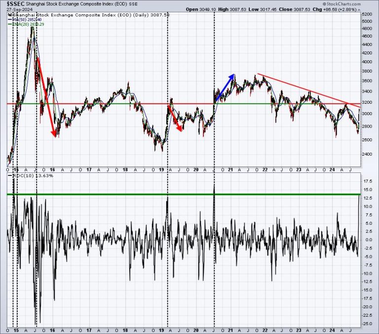 China’s Shanghai Composite Index ($SSEC) surged higher last week by roughly 13%, which was one of its largest 1-week gains over the past decade. There were solid economic reasons for the surge as China’s central bank approved measures to accelerate recent sluggish growth. The People’s Bank of China on Tuesday announced plans to lower borrowing costs, inject more funds into the economy, and ease households’ mortgage repayment burdens. Despite these fundamental positives for the China economy, I’d argue that the index remains challenged technically, however, as overhead price resistance and trendline resistance suggest the most difficult levels to overcome remain: