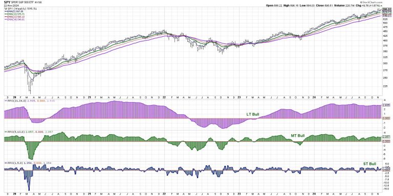 Note our long-term model (purple histogram) has been bullish for all of 2024, exactly as we logged in 2021. We can see the same pattern of consistent bullishness from the medium-term mode (green histogram) for both years. Even the short-term model appears to identify pullbacks of a similar timeframe and depth for both years.
