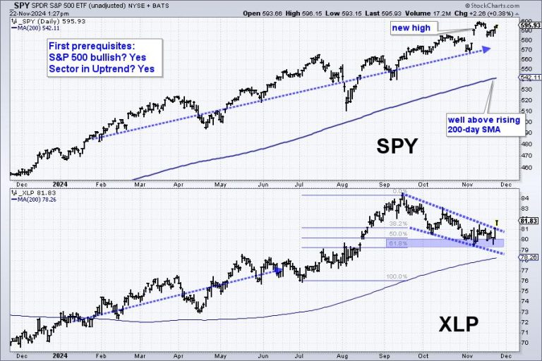 Also notice that XLP is breaking out this week. The ETF formed a falling wedge and retraced 50-62.18% of the July-September advance. Both the pattern and the retracement are normal for corrections within bigger uptrends. XLP is breaking out of the wedge to signal a continuation of the bigger uptrend.