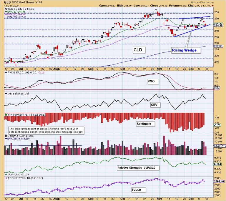 The weekly chart shows the root of the problem, which is the parabolic advance (+71%) from the 2022 low. Parabolic advances beg for correction, which can sometimes be severe. In the case of GLD, we do not expect more than a sideways digestion process to dampen the angle of ascent.
