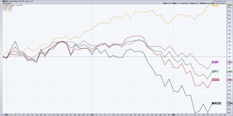 The S&P 500 index is now down about 4.0% for the year, even with Friday’s strong finish to the week. The Roundhill Big Tech ETF (MAGS) is down 12.4%, while the growth-heavy Nasdaq 100 is down about 6.2%. The SPDR Gold Shares (GLD), meanwhile, is up another 13.7% in 2025 after an exceptionally strong 2024.