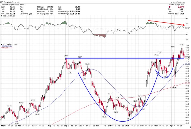 The safe trade in KO has lost momentum on each rally, as seen in the lower highs of its relative strength index (RSI). This bearish divergence is cause for concern as price hits a crossroads into earnings.