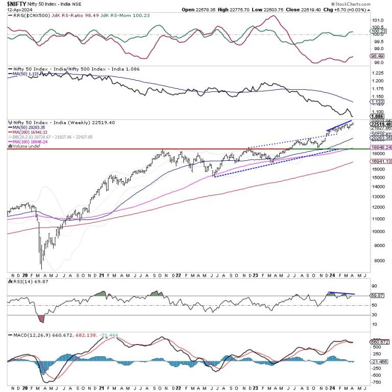 The previous week was truncated as Thursday was a trading holiday on account of Eid-ul-Fitr. The coming week is also truncated, with Wednesday being a holiday on account of Ram Navmi. Due to this Banknifty Options has its shortest expiry as they would expire as early as Tuesday. The level of 22775 creates a new intermediate top for the markets; over the coming days, no runaway upmove is expected so long as the Nifty stays below this point. At the same time, the nearest support for the index exists much below the current levels at 20-week MA which is placed at 21827. By and large, the markets are likely to stay in a broad trading range.