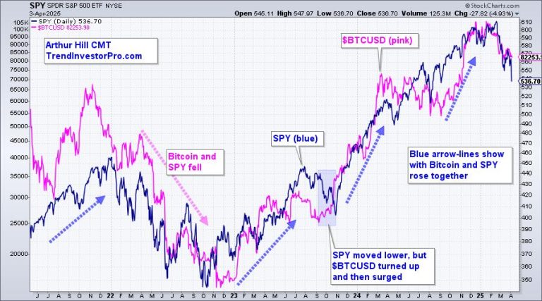 Bitcoin shows short-term relative strength, but remains short of a relative breakout. The next chart shows Bitcoin relative to SPY ($BTCUSD/SPY ratio). Bitcoin underperformed from June to September 2024, outperformed from October to December (blue arrow-line) and underperformed in February-March (pink arrow-line).