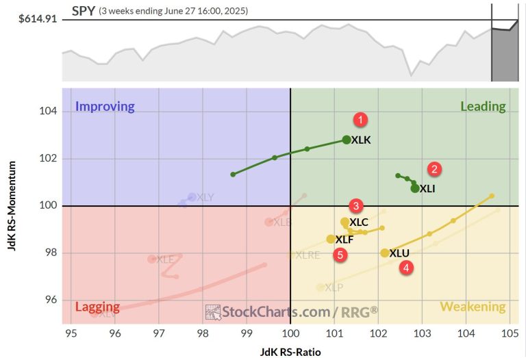 The weekly Relative Rotation Graph (RRG) paints a clear picture of Technology’s strength, as it powers further into the leading quadrant. Industrials is still in the lead but starting to lose some relative momentum — though it’s maintaining the highest RS ratio reading. Communication Services is showing a clear upward rotation, while Financials and Utilities are inside the weakening quadrant with negative headings (but still above the 100 level, keeping them in the top five).
